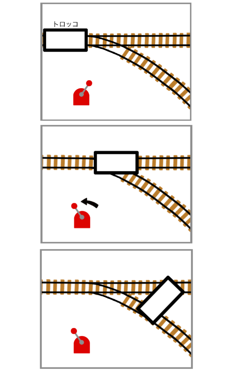トロッコの前輪が、切り替えポイントに差し掛かってすぐにレバーを切り替え、前輪と後輪を別の線路へ進めることでトロッコは先に進めなくなって止まります。